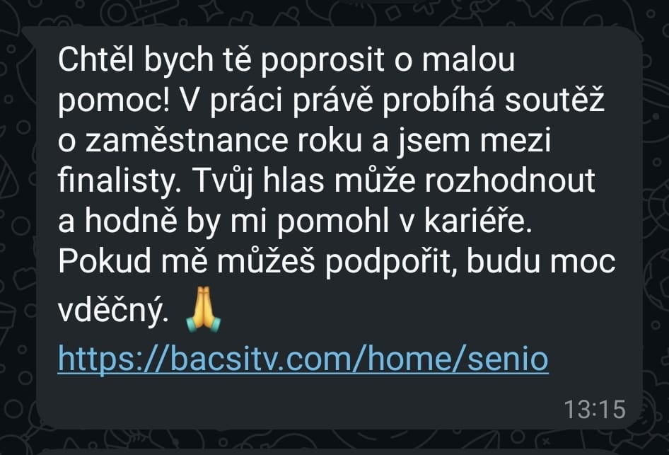 WhatsApp jednoho z nás byl napaden a rozesílá zprávy na všechny strany s tímto zněním. Na nic neklikejte, žádné své citlivé údaje nezadávejte, zprávu rovnou smažte. Omlouváme se.